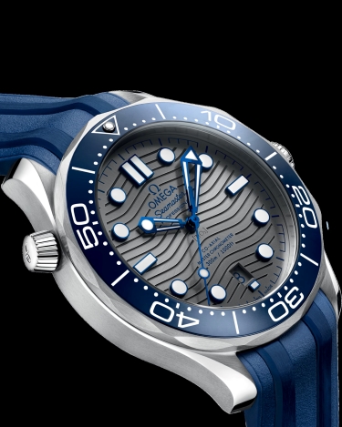 The watch is presented on a blue rubber strap and is driven by the OMEGA Master