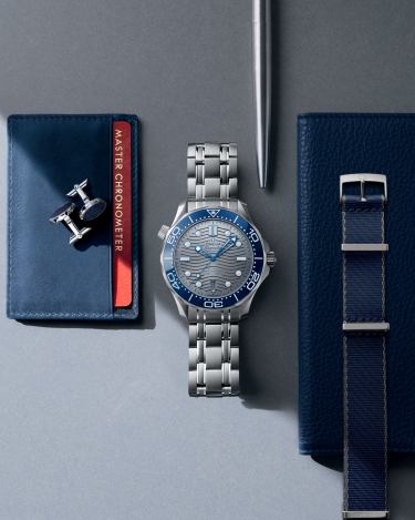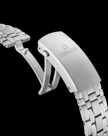 The watch is presented on a stainless steel bracelet and is driven by the OMEGA Master
