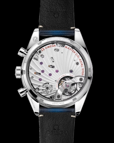 The watch is presented on a blue leather strap with an OMEGA logo in postive