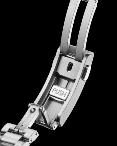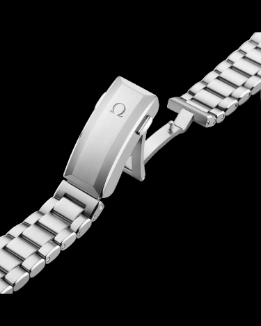 The watch is set on an O-MEGASTEEL bracelet with OMEGA’s patented extendable