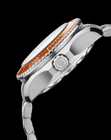 This 45.5 mm model in robust O-MEGASTEEL features a polished orange ceramic