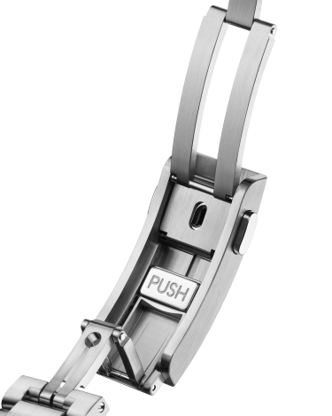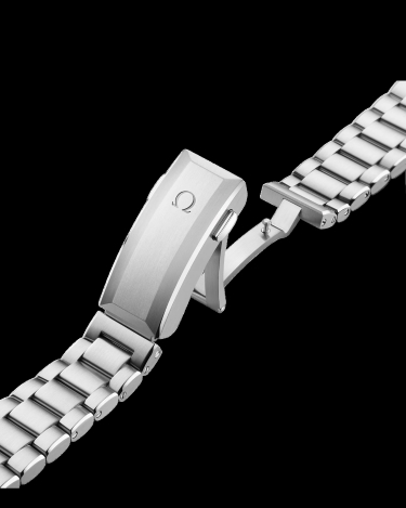 The watch is set on an O-MEGASTEEL bracelet with OMEGA’s patented extendable foldover